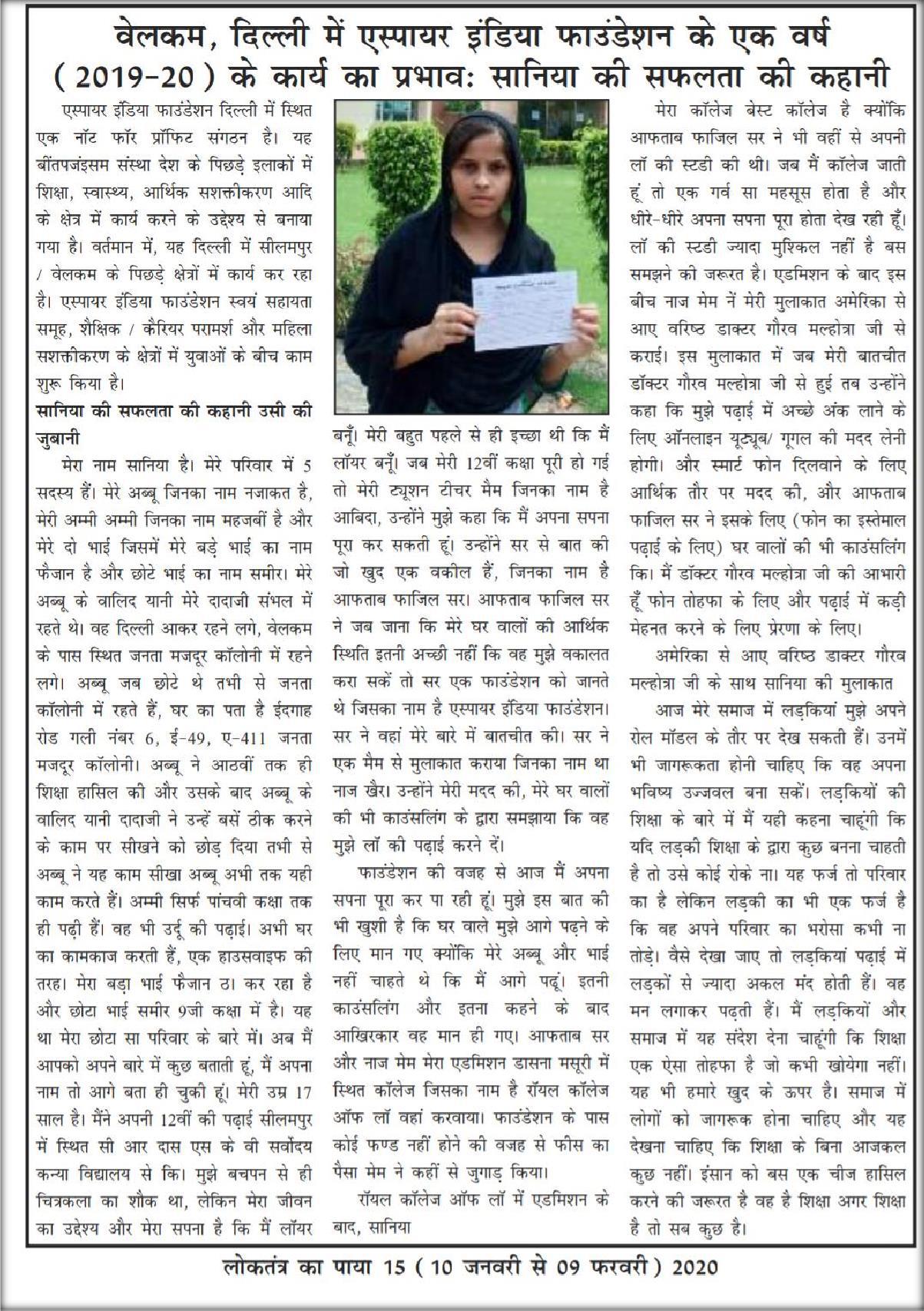 A visitor to AIF from America, Dr. Gaurav Malhotra was very pleased to interact with Sania and motivate her (Picture below). A newspaper, ‘Loktantra Ka Paya’ also carried a story on Sania’s success. A clipping of the same is provided below: